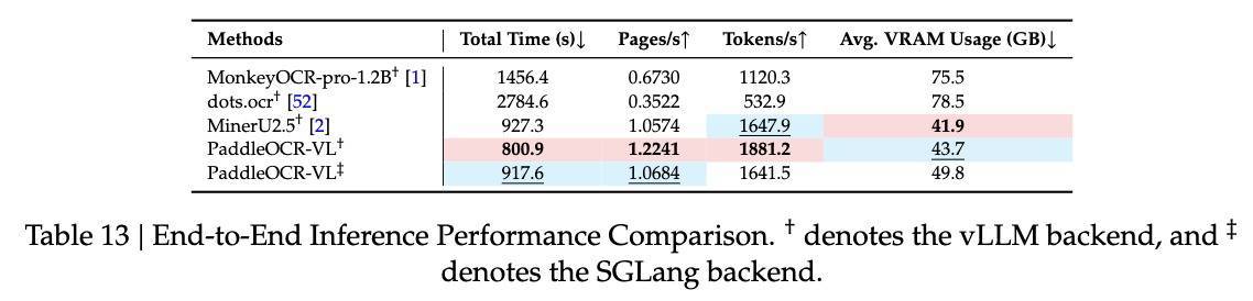 推理性能方面,研究人员在OmniDocBench v1.0数据集上测量了端到端推理速度和GPU使用情况,并在单个NVIDIA A100 GPU上以512个批次处理PDF文件。PaddleOCR-VL在处理速度和内存效率方面均展现出明显且一致的优势。与领先的基准MinerU2.5相比,部署vLLM后端后,其页面吞吐量提高了15.8%,token吞吐量提高了14.2%。此外,PaddleOCR-VL GPU内存占用比dots.ocr减少了约40%。