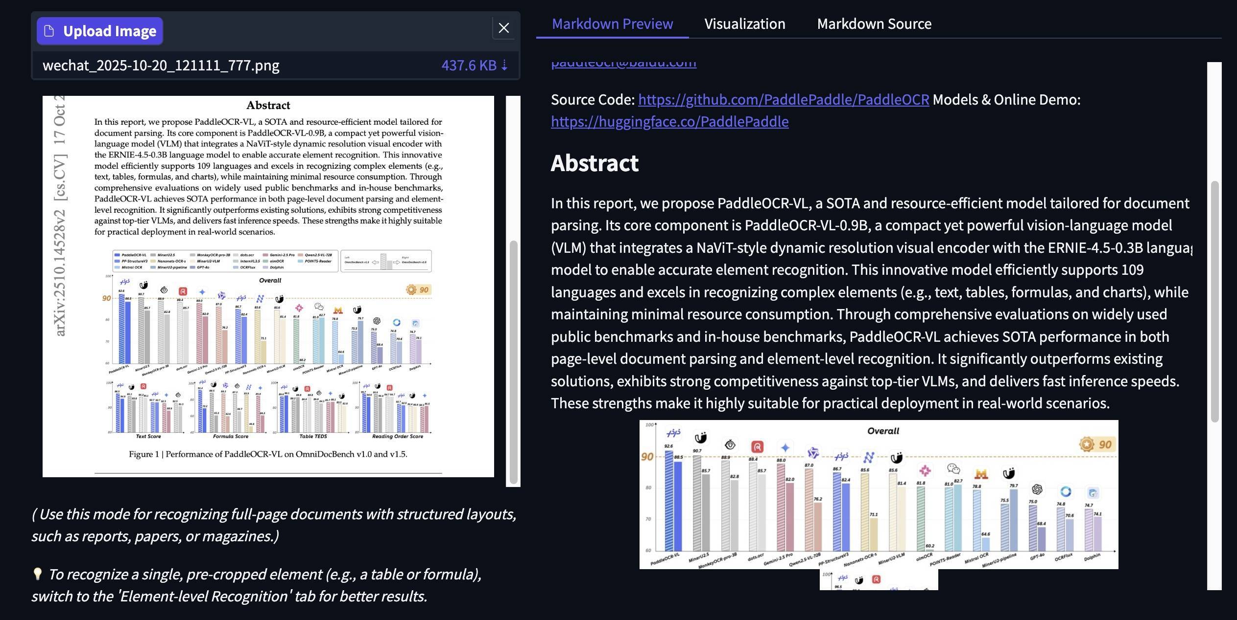 智东西上传了PaddleOCR-VL论文的首页广升网,识别结果中,模型自动识别出了链接、邮箱地址,并准确将图表进行了切分。