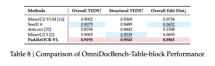具体来看,PaddleOCR-VL模型取得了92.56的综合最高分,超过了排名第二的MinerU2.5-1.2B(90.67)。PaddleOCR-VL在子任务中取得了新的SOTA成绩,包括最低的Text-Edit距离、最高的Formula-CDM分数以及Table-TEDS、Table-TEDS-S。论文提到,这表明该模型在文本识别、公式识别和复杂表格结构分析方面拥有较高准确率。