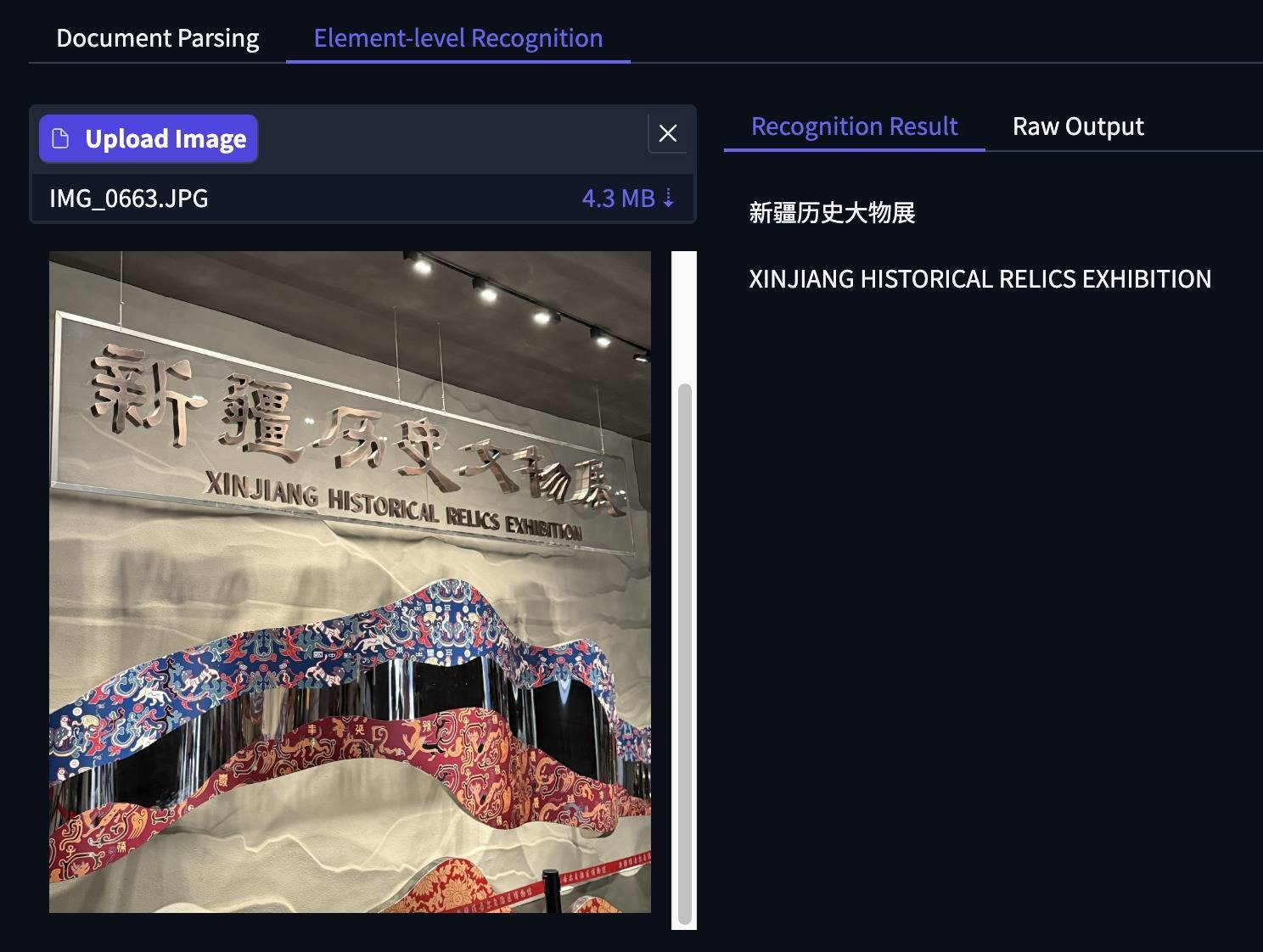 下面图片的拍摄角度是侧面,因此右侧文字有反光,模型错误将“文”识别为“大”,但后面的“物”即使有反光+变体,模型的识别结果也没有出错,同时下方的英文识别也完全正确。