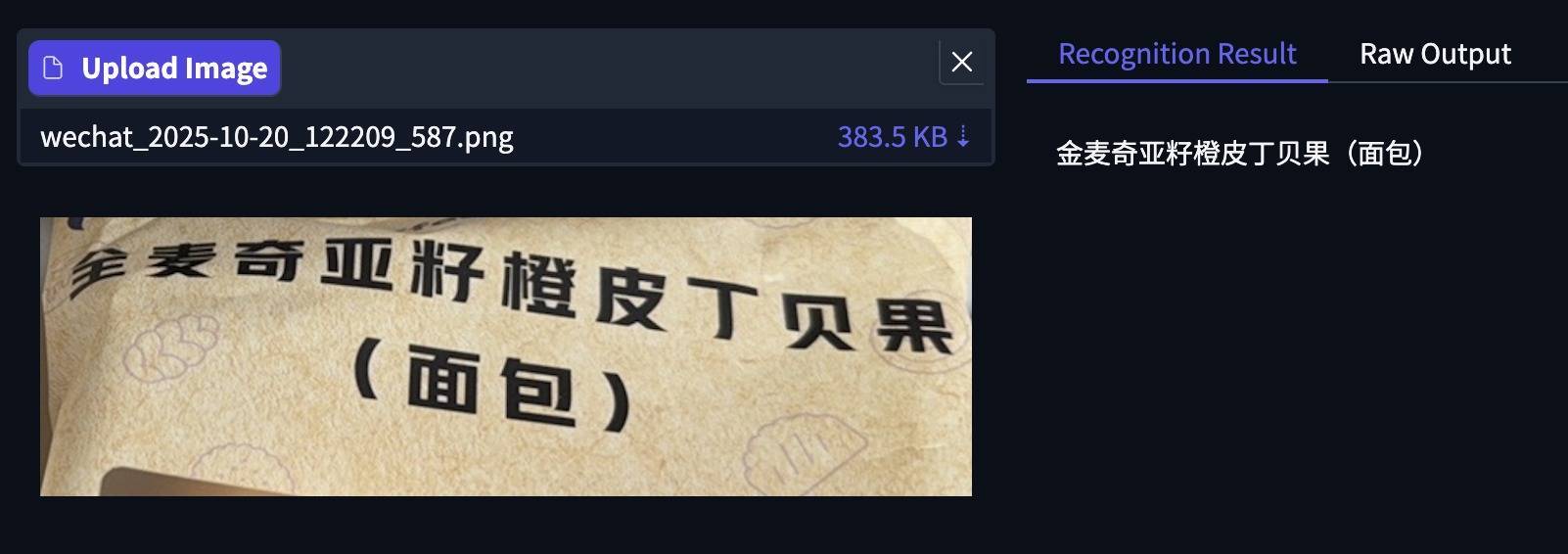 其次为画面不清晰的中文识别,可以看到下面包装袋左上角有褶皱,模型错误将第一个“全”字识别为“金”,其余文字均准确。