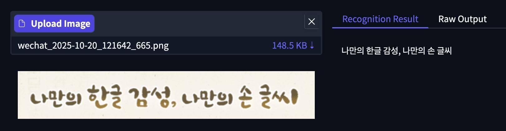 文字识别中,智东西上传了中文、韩语。下面是一张手写体的韩语图片,模型识别结果准确。