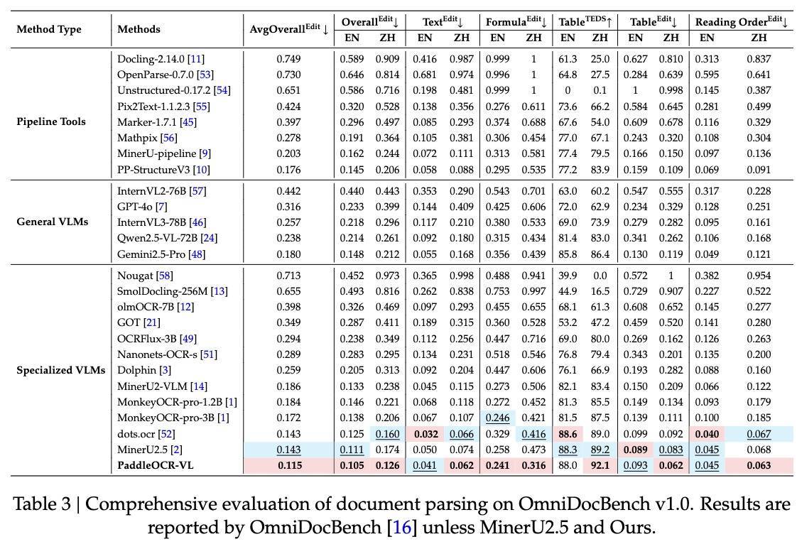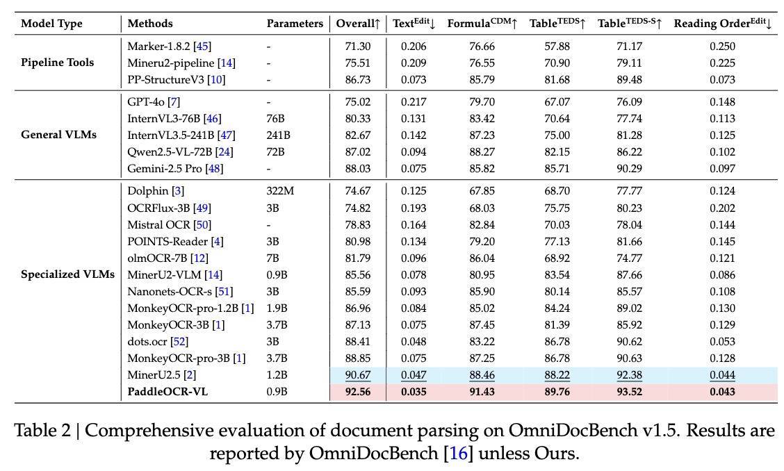 PaddleOCR-VL在OmniDocBench v1.5上实现了整体、文本、公式、表格和阅读顺序的SOTA性能,在所有关键指标上均超越现有流水线工具、通用VLM和其他专用文档解析模型。
