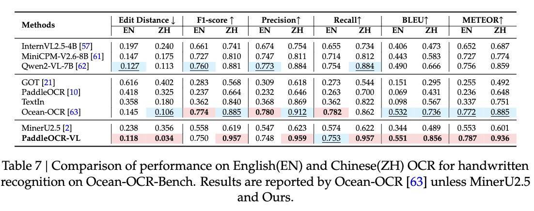 Ocean-OCR-Handwritten是一个行和段落级别的手写评估数据集,模型在英文中实现了0.118的最佳编辑距离,并在F1得分、精确度、召回率、BLEU和METEOR方面表现出色,模型在中文中编辑距离为0.034。