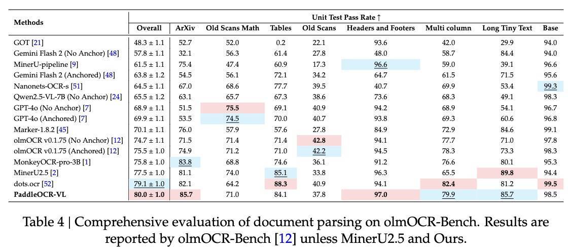 olmOCR-Bench主要通过简单、清晰且机器可验证的单元测试来评估工具和模型。PaddleOCR-VL在olmOCR-Bench评测中取得了80.0±1.0的最高总分,在ArXiv(85.7)、页眉和页脚(97.0)方面领先,并在多列文本(79.9)和长小文本(85.7)方面排名第二。