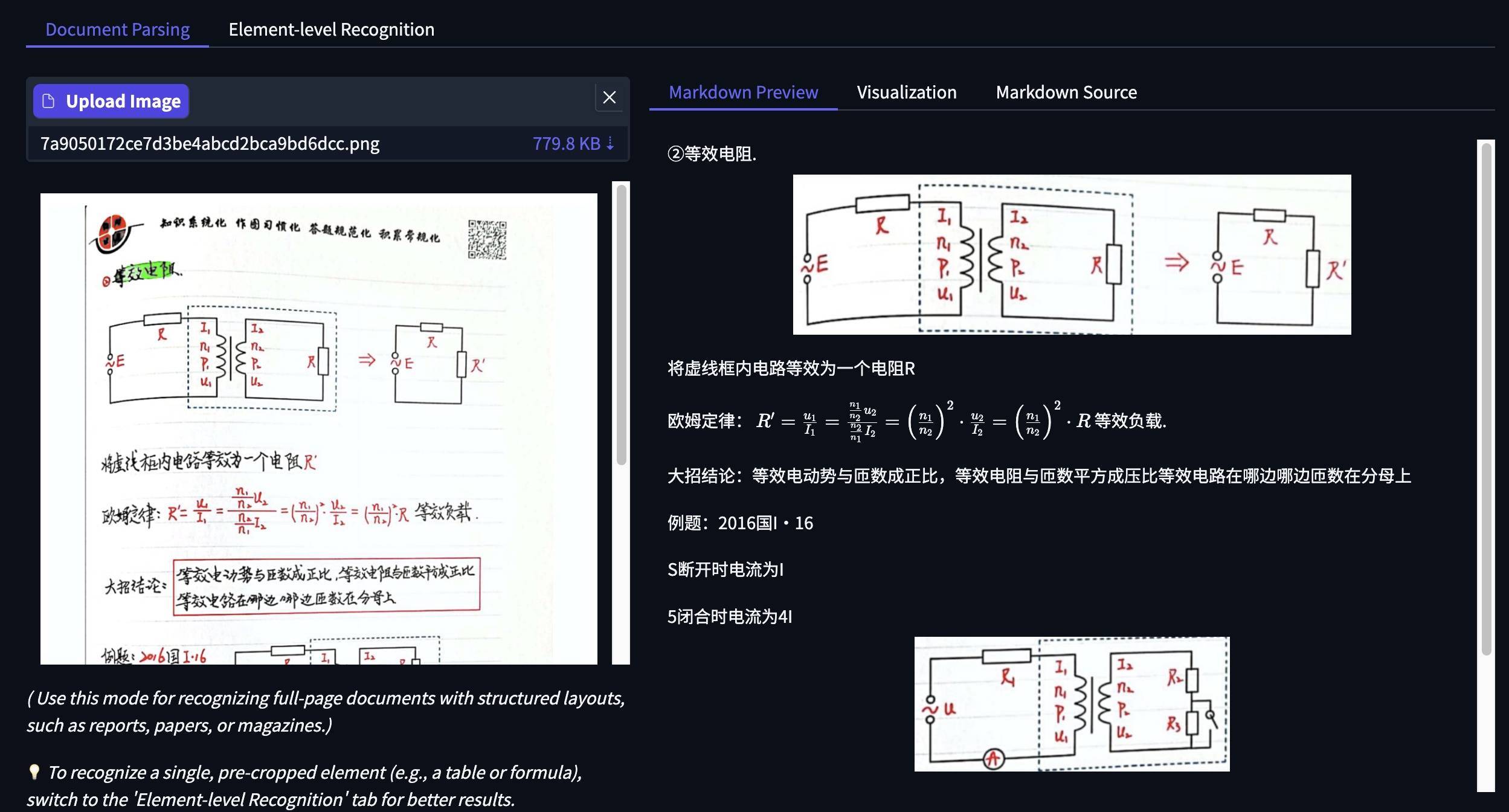 下面是一道物理题目,模型自动识别出了页眉部分的标语,小标题、图表、复杂公式识别准确。
