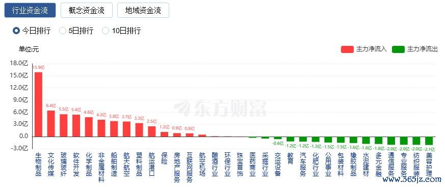 行业资金方面,截至收盘,生物制品、文化传媒、玻璃玻纤等净流入排名靠前,其中生物制品净流入15.89亿。
