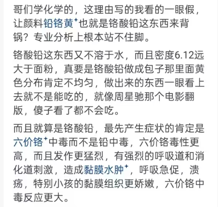 还有网友从专业上质疑称,一千克颜料的铅含量是90毫克,送检的两块糕点铅含量是1000多。想做出1000铅毫克的糕点,一斤面粉大概兑几十斤颜料。