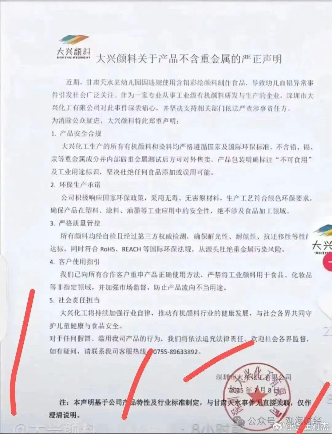 一份由深圳市大兴化工有限公司发布的《大兴颜料关于产品不含重金属的严正声明》称: